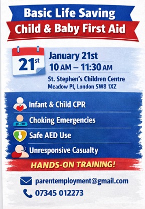 Learn some basic live-saving skills at our FREE session at St. Stephen’s Children’s Centre, Meadow Place, SW8 1XZ